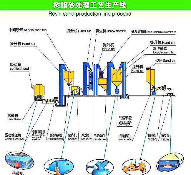 ● resin sand molding production line is generally composed of preparation station, molding station, hardening station, mold lifting station, running trolley, flow coating station, surface drying furnace, lower core box station, casting cooling line, etc.